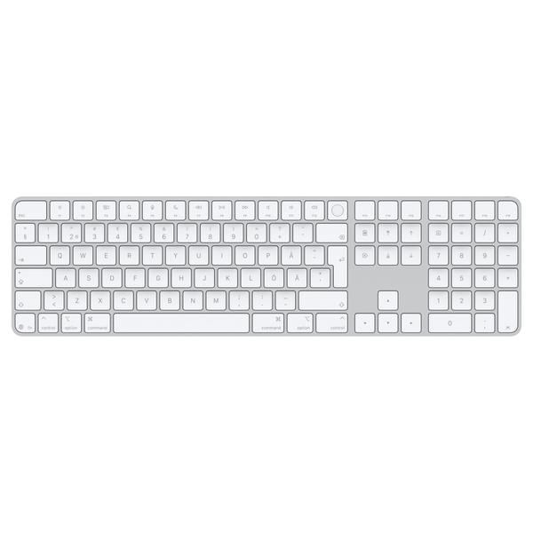 Apple Magic Keyboard with Touch ID and Numeric Keypad for Mac models with Apple silicon (USB‑C) - Swedish - White Keys MXK73S/A Magic Keyboard is available with Touch ID, providing fast, easy and secure authentication for logins and to unlock your Mac. Magic Keyboard with Touch ID and Numeric Keypad delivers a remarkably comfortable and precise typing experience. It features an extended layout, with document navigation controls for quick scrolling and full-size arrow keys, which are great for gaming. The numeric keypad is also ideal for spreadsheets and finance applications. It’s wireless and features a rechargeable battery that will power your keyboard for about a month or more between charges.¹ It pairs automatically with your Mac, so you can get to work straightaway. It features a USB-C port and includes a woven USB-C Charge Cable that lets you pair and charge by connecting to a USB-C port on your Mac, so you can charge all of your favourite devices with just a single cable. Specifications: Size and Weight Height: 0.41-1.09 cm (0.16-0.43 inches) Width: 41.87 cm (16.48 inches) Depth: 11.49 cm (4.52 inches) Weight: 0.369 kg (0.81 pounds) General Multimedia keys Connections and Expansion Bluetooth USB-C port Wireless System Requirements Mac with Apple silicon using macOS 15.1 or later What’s in the Box Magic Keyboard with Touch ID and Numeric Keypad USB-C Charging Cable