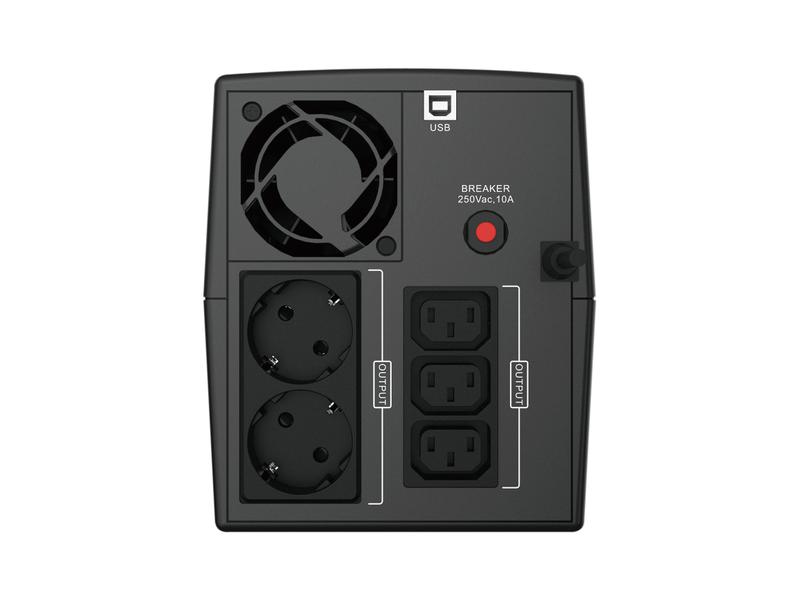 | UPS-topologi | Linjeinteraktiv | | Uteffekt kapacitet (VA) | 2,2 kVA | | Uteffekt | 1320 W | | Inmatning spänning (min) | 220 V | | Inmatning spänning (max) | 240 V | | Utgång, driftspänning (min) | 220 V | | Utgång, driftspänning (max) | 240 V | | Automatisk spänningsreglering (AVR) | Ja | | Effekt skyddsfunktioner | Överbelastning | | Hörbart larm | Ja | | Hörbara alarmlägen | Larm när batteriet är på, Fel, Larm vid låg batterinivå, Överbelastningslarm | | Automatisk omstart | Ja | | Ursprungsland | Kina | Anslutningar |