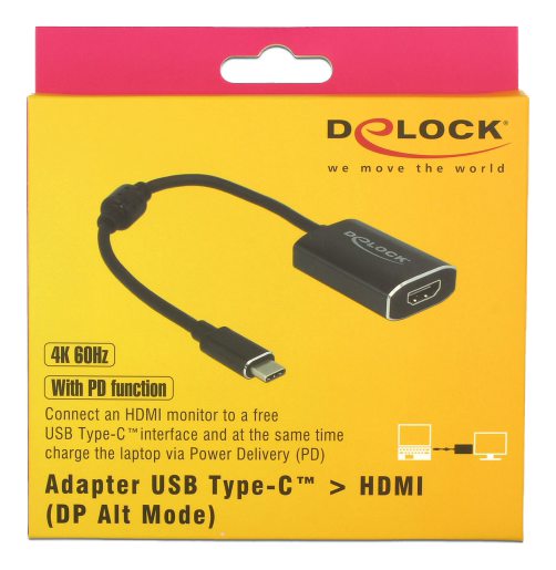 This Delock adapter is suitable for the connection of a HDMI monitor to a computer with USB-C™ interface and Displayport alternate mode support. Thus, the adapter can be connected to different laptops like Macbook, Chromebook and similar. In addition, the adapter can also be operated on a Thunderbolt™ 3 interface. The adapter has a USB Type-C™ Power Delivery port. This allows the laptop to be charged while the adapter is in use.