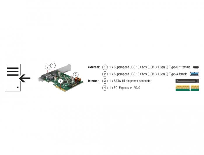 This PCI Express card by Delock expands the PC by two external USB 3.1 ports. Different USB Type-A devices, such as docking stations, card readers, external enclosure etc., can be connected to the card. The card allows a data transfer rate of 10 Gbps on both ports when used simultaneously.
