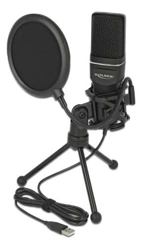 This USB condenser microphone by Delock can be used for high-quality voice and vocal recordings.Optimal recordingsThe microphone has a cardioid polar pattern (unidirectional) and captures the sound ideally. Due to a high power, low self-noise and precise performance, even the finest sounds are optimally recorded.Dual Layer Pop Filter & WindscreenDue to the included dual layer pop filter and the windscreen, the recording quality is further optimized. Annoying wind noises are optimally filtered.Plug & PlayDue to USB Plug & Play the microphone is ready to use immediately, no driver installation is needed. The microphone works with all common operating systems such as Windows, Mac OS, Chrome OS and Linux.Stable & non-slip standThe metal base with rubber feet ensures that the microphone stands stable on the table. The shock mount (spider) ensures vibration-free recording. The table stand can be folded and transported easily if required.