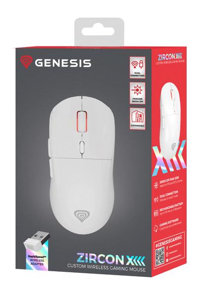 GENESIS Zircon XIII. Formfaktor: Ambidextrous. Rörelsedetektor-teknik: Optisk, Gränssnitt: RF Wireless + USB Type-C, Rörelseupplösning: 26000 DPI, Typ av knappar: Tryckbara knappar, Antal knappar: 7, Scroll-typ: Hjul, Accelerering (max): 50 G. Belysningsfärg: Multi. Strömkälla: Batterier/Kabel. Produktens färg: Vit