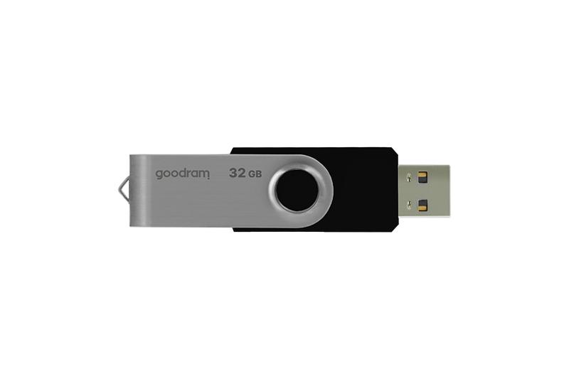 Goodram UTS2. Kapacitet: 32 GB, Gränssnitt: USB Type-A, USB-version: 2.0, Läshastighet: 20 MB/s, Skrivhastighet: 5 MB/s. Formfaktor: Sväng. Vikt: 15 g. Produktens färg: Svart