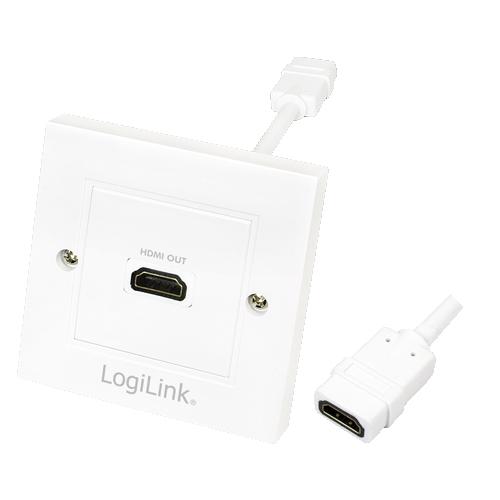 HDMI Wall Plate with 1x HDMI female LogiLink® HDMI wall plate from LogiLink with HDMI socket (wall socket) to DVI Female (internal). The internal connection is via a short HDMI cable with HDMI connector. Supports standards to HDMI High Speed with Ethernet. Gold-plated contacts and shielded. HDMI wall plate Connections: 1x HDMI female Supports: HDMI High Speed with Ethernet Gold-plated contacts Shielded Color: White