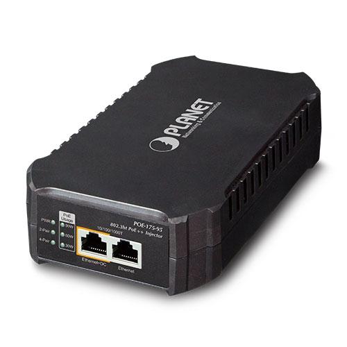 Planet POE-175-95. Kommunikationsstandarder: IEEE 802.3bt, Kabelteknik: 10/100/1000Base-T(X), Kabel standard: Cat6. Produktens färg: Svart. Spänning: 100 - 240 V, Utgångsspänning: DC 54, Uteffekt: 95 W. Bredd: 170 mm, Djup: 100 mm, Höjd: 40 mm